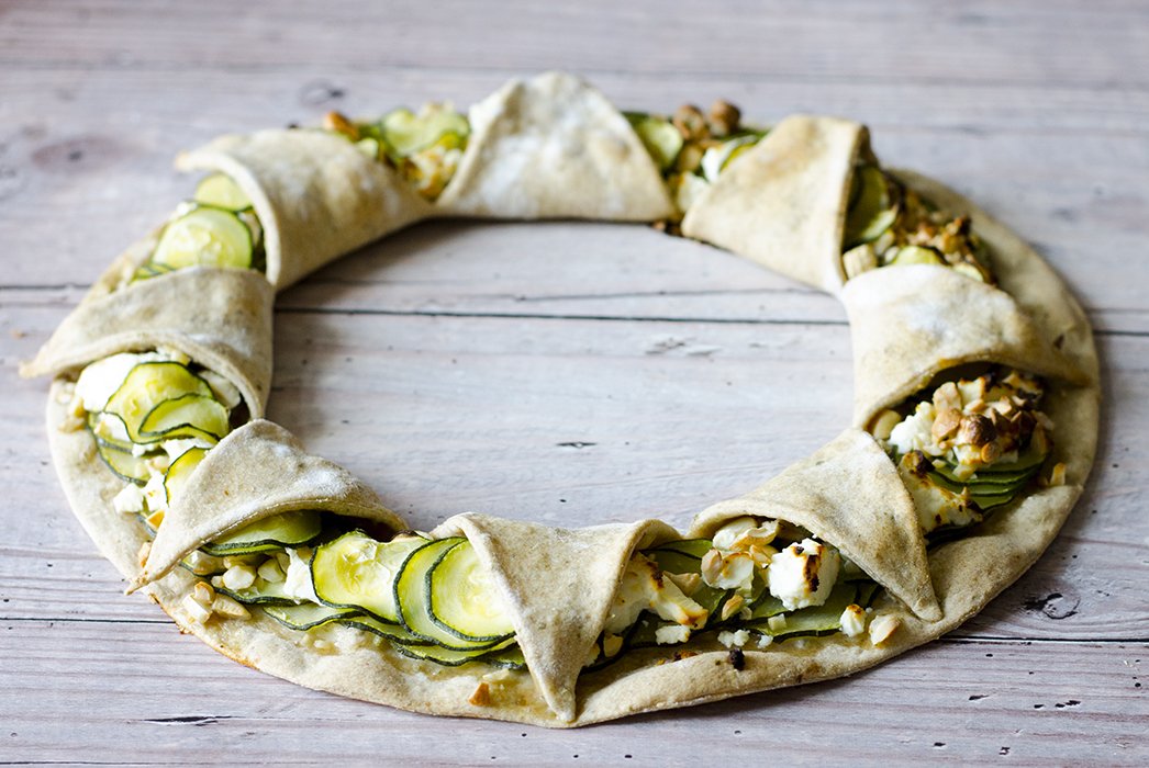 Ezt a cukkinivel, fetával, és kesudióval töltött koszorút tulajdonképpen a tésztája miatt szoktam sütni, leginkább vendégváró falatnak, mert szerintem a tésztája az igazi finomság, és az, hogy mi van benne, csupán másodlagos. De most, hogy tavaszváró hangulatba kerültem, sőt, nyárváróba egyenesen, így igazi nyári töltelékkel sütöttem.