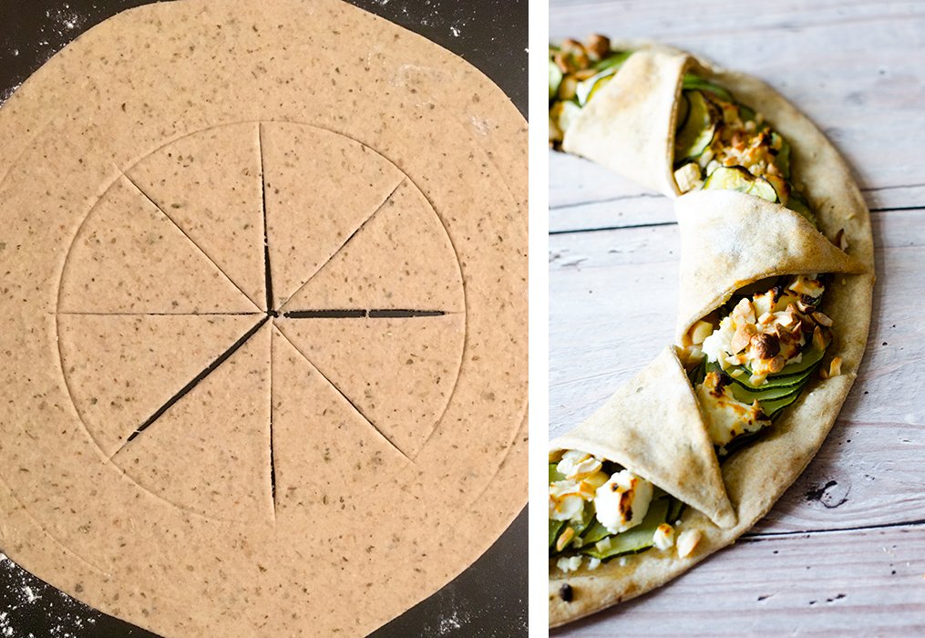 A tészta szélére felpakoljuk a vékonyra vágott cukkinit, majd rámorzsoljuk a fetát, és megszórjuk a kesudióval. Pár csepp olívaolajat csepegtetünk rá, kakukkfűvel és borssal ízesítjük.