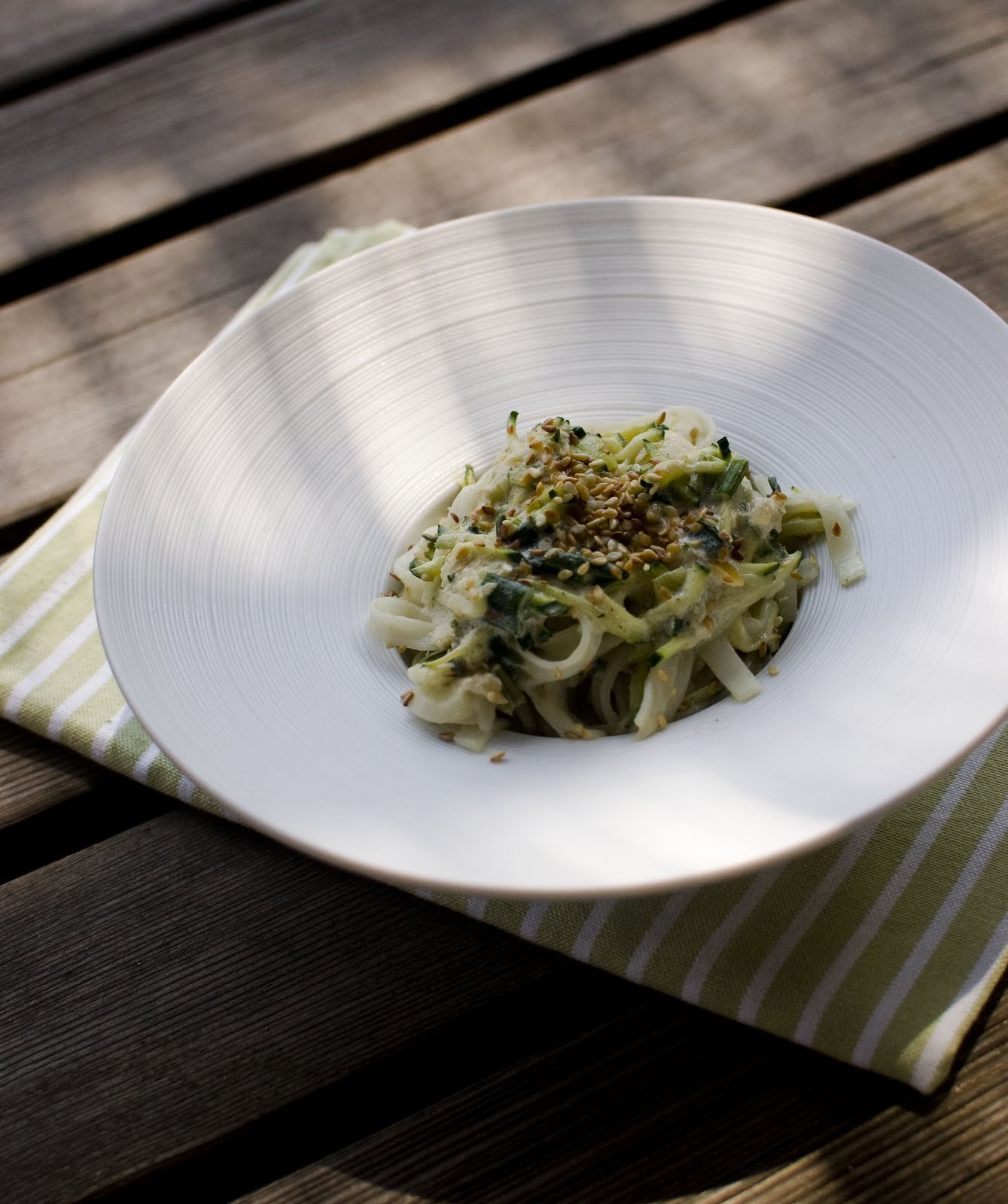 A koriandert száraz serpenyőben megpirítottam, majd benne is hagytam. A hagymát karikákra vágtam, és picit megfuttattam az olajon. Beledobtam a szintén felkarikázott citromfüvet és fokhagymát, majd belereszeltem egy picit a lime héjából. Felöntöttem az osztriga szósszal, és a mézzel, majd a kókusztejjel, beledobtam a chilit és koriandert. Elzártam alatta a lángot. Leöntöttem a rizstésztát forró vízzel és hagytam megpuhulni. Közben vékony csíkokra metéltem a cukkinit, és megforgattam a szószban. Szezámmaggal megszórva tálaltam.