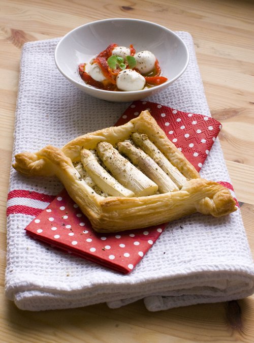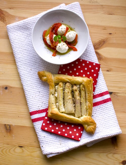 A sajtot összetörtem villával, és elkevertem a krémsajttal, majd a majorannával. Megpucoltam a spárgát és akkora darabokat vágtam belőle, mint amekkora kosárkát készítettem a tésztából (Az aljából leves készült.) A sajtot belekentem a kosárkába, jó vastagon. Ebbe ültettem a spárgákat, és mehetett a sütőbe. 200 fokon harminc perc alatt készül el. A spárga ennyi idő alatt pont tökéletes, még bőven roppanós, de nem kemény állagú lesz. Csak miután elkészül, akkor sóztam és borsoztam.