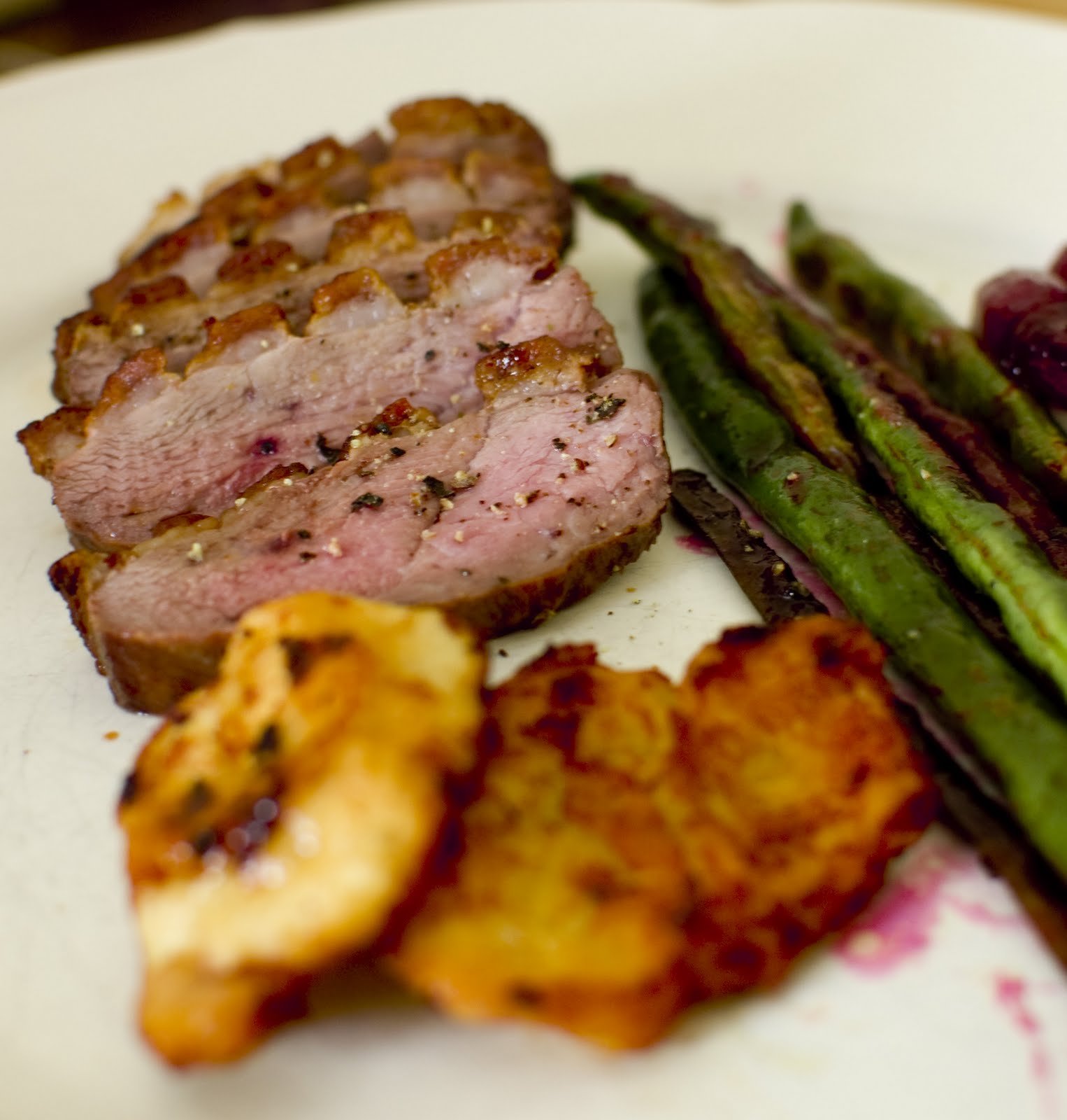 Szedjük le a zöldségeket, és öblítsük le őket. A libamelleket beirdaltam a bőrös felén, sóztam, borsoztam, és forró serpenyőbe tettem bőrével lefelé. Öt perc múlva megfordítottam, megszórtam a rozmaringgal és további öt percig sütöttem. Közben elkészítettem a köretet.