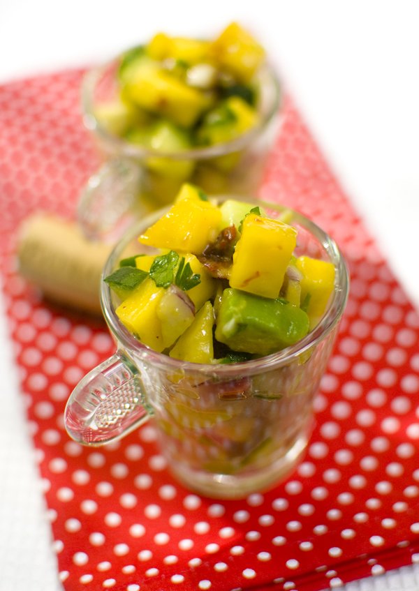 A hozzávalókat összekeverjük egy tálban, öt percig állnihagyjuk, és azonnal fogyasztjuk. Nem jó, ha túl sokat pácolódnak a gyümölcsök és a hús, inkább érezzünk ki minden ízt egyenként egy picit.