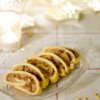 A tésztához a hozzávalókat géppel összegyúrjuk, majd három részre osztjuk, gömböket formázunk belőle, és letakarva hűtőben 30 percig pihentetjük. A tésztát kinyújtjuk kb. 3 mm vastagra, elosztjuk rajta a tölteléket, feltekerjük, majd megkenjük a tojás sárgájával. Hideg helyen hagyjuk, amíg a teljesen megszárad (15-20 perc), majd megkenjük a tojás fehérjével is, és azt is rászárítjuk. 180 fokos sütőnem kb. 25 percig sütjük.