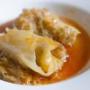 A karalábékat a kivájt belsejével együtt a maradék hagymára tesszük, felöntjük annyi vízzel, amennyi majdnem ellepi, hozzá adjuk a babérlevelet, sózzuk, borsozzuk, és gyöngyözve megfőzzük. Közben beáztatjuk a zsömlét, majd kinyomkodjuk.