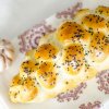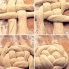 Osszuk kétfelé, majd a két részt annyi egyforma részre, ahány szálból fonjuk majd a kalácsokat. Én ötös fonással fontam, vagyis összesen 10 szálat készítettem. Miután a kalácsot megfontuk, tegyük sütőpapírral bélelt tepsire, kenjük le tojással, és hagyjuk pihenni 20 percig, közben melegítsük elő a sütőt 180 fokra.