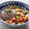 Tetejére a darabolt diót és a felkarikázott újhagymát szórom.