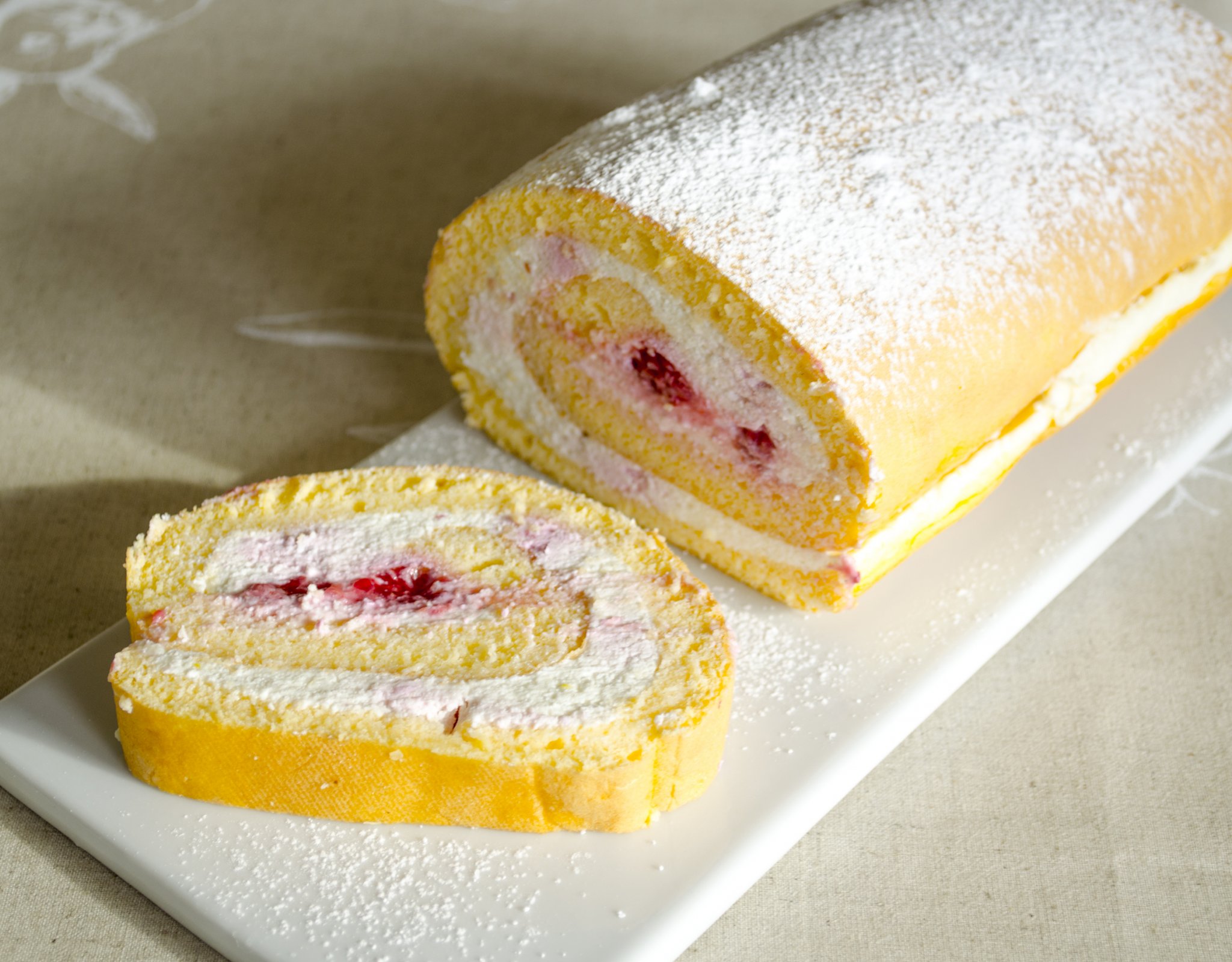 A langyosra hűlt piskótára kenjük fel a krémet, majd egyenletesen nyomkodjuk bele a fagyos málnaszemeket. Tekerjük fel, és 2 órára tegyük a hűtőbe szeletelés előtt.