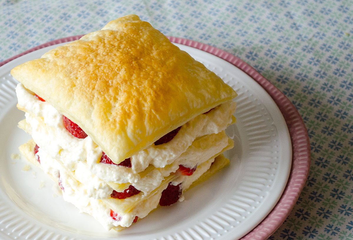 Mindössze négy hozzávalóra van szükségünk: a félkész levelestészta-lapra, a tortakrémre, kevés tejre és némi gyümölcsre.