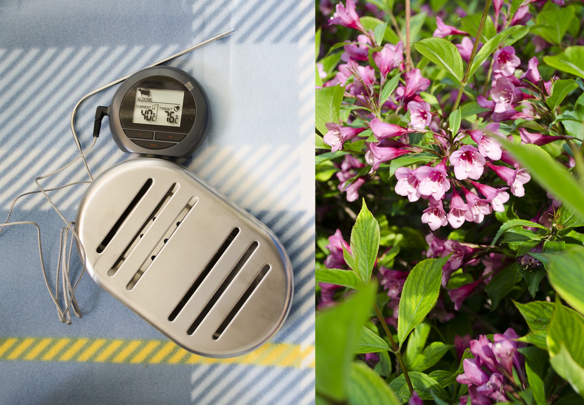 A grillre ráhajtjuk a tetejét, hogy a jó füst bentmaradjon, és indulhat is a móka. A mellet először bőrével lefelé sütjük, majd megfordítjuk, beleszúrjuk a húshőmérőt, nehogy túlsüssük, vagy esetleg nyers, hideg maradjon a közepe, főleg ha nagydarab húst sütünk. Legyen tökéletes, pont olyan, amilyennek szeretjük. Marhát szerintem nem is érdemes húshőmérő nélkül nagy darabban megsütni, azzal viszont olyan egyszerűen lesz tökéletes, hogy ha nem parázson sütnénk, akkor az ötéves lányomra is rá merném bízni a feladatot.