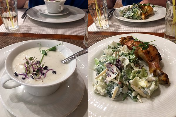 Sajtkrémleves, sült csirkecomb joghurtos salátával, és bodzaszörp volt, 950 forintért. Azon felül, hogy a csirkecomb is nagyon finom volt, én a joghurtos salátának örültem a legjobban. Nem is emlékszem, hogy valaha ettem-e ilyesmit étteremben, hogy volt-e valaki, aki bevállalta volna ezt az egyszerű, de nagyon finom salátát köretként? Pedig milyen jó!