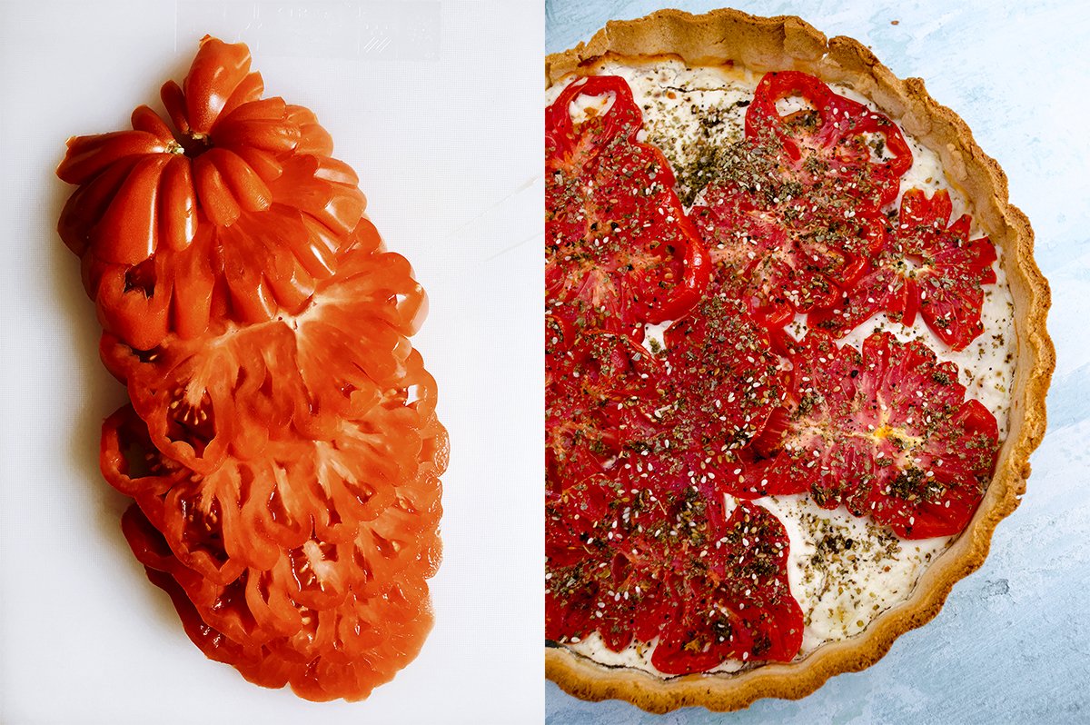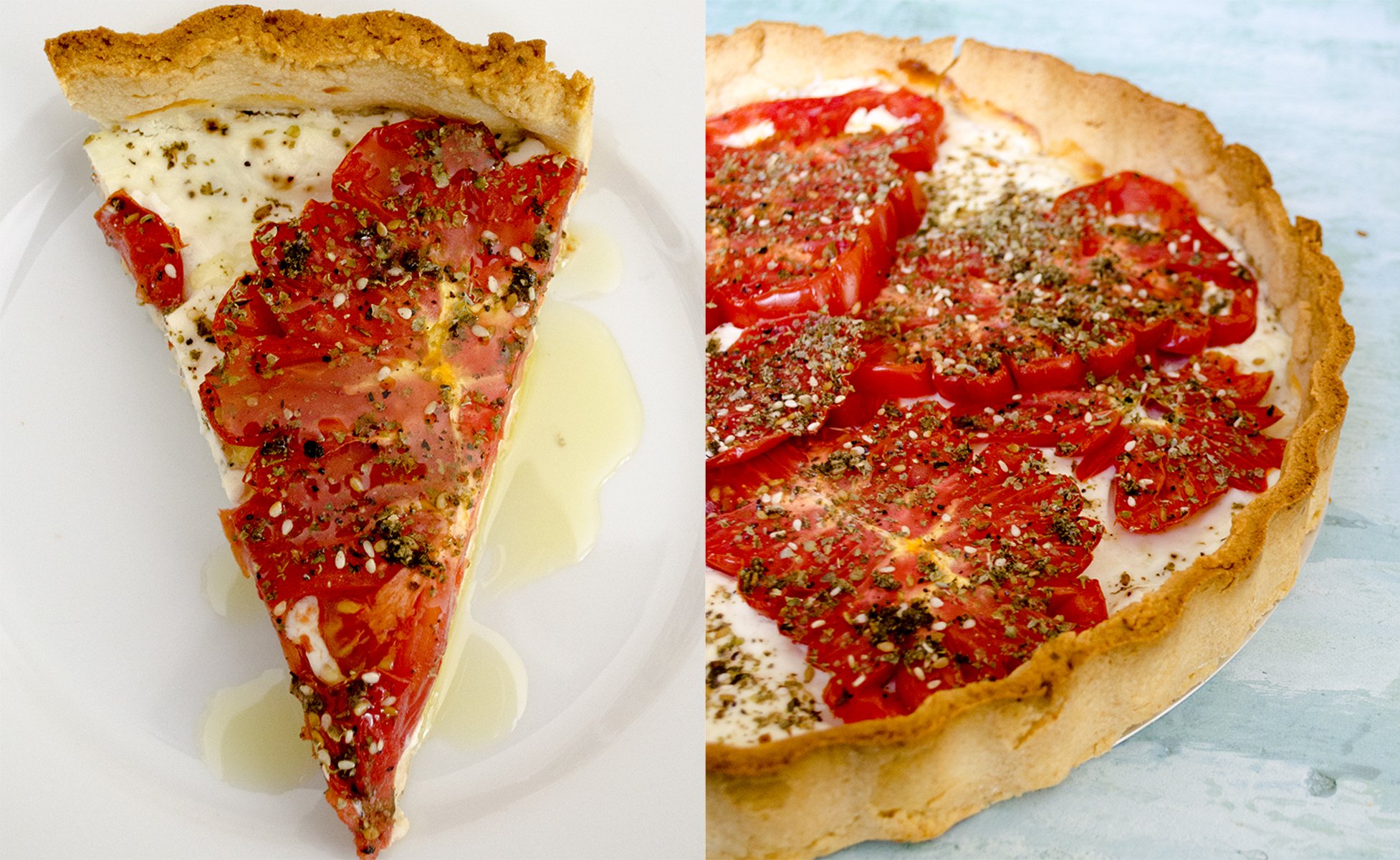 Pár napja láttam az Instagramon egy klassz paradicsomos pitét, igaz, ott cukkinivel rétegezték a paradicsomkarikákat, nekem meg cukkinim nem volt itthon, ellentétben a kecskesajttal.