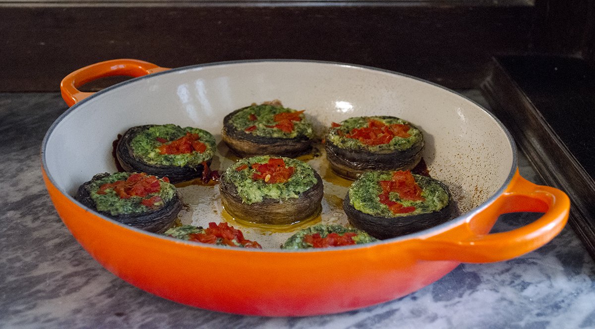 Közben a spenótot megfonnyasztottam egy serpenyőben, épp csak annyi vízzel, amennyi a leveleken maradt mosás után. Rádobtam a mascarponét, a mandulát, majd belereszeltem a fokhagymát, és picit megsóztam. A masszát elosztottam a gombakalapokba.