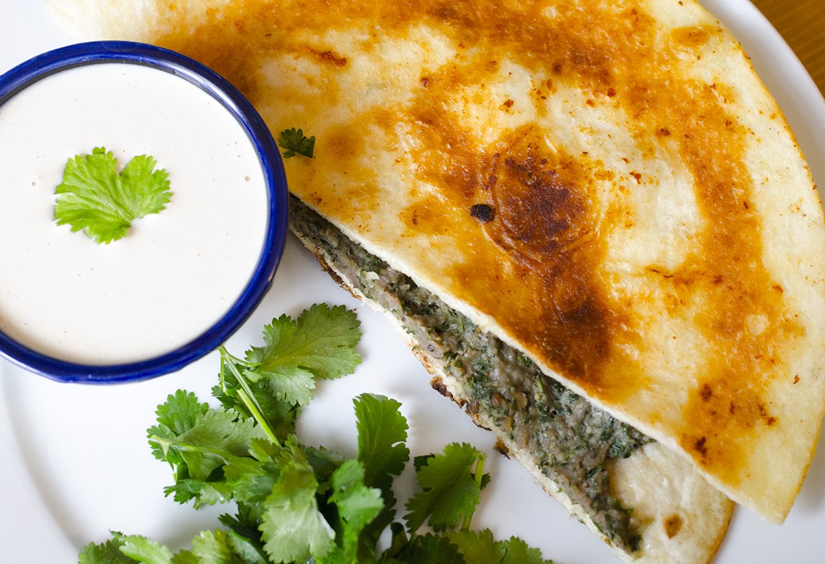 Én hatalmas serpenyőben sütöttem, kevés olajat alácsurgatva, mindkét oldalát 2-2 percig, majd megtöltöttem a hússal, amit vékonyan szétkentem a tésztán, végül félbehajtva az. Mérsékeltem a tüzet és mindkét oldalaán újabb 2-2 percig sütöttem, de lehet sütőben is, két tésztát egymásra téve.