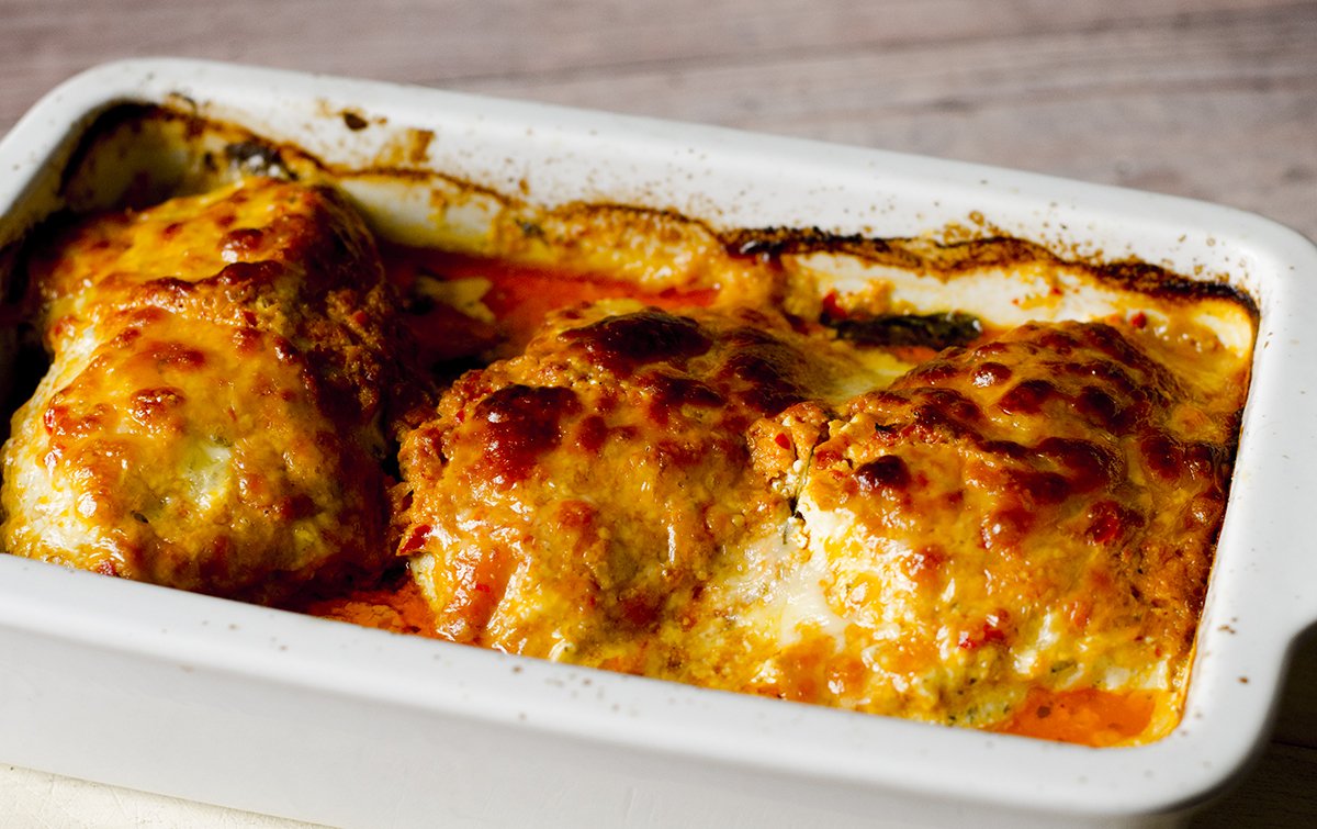 A masszát a csirkemell tetejére halmozom, majd meszórom a sajttal.