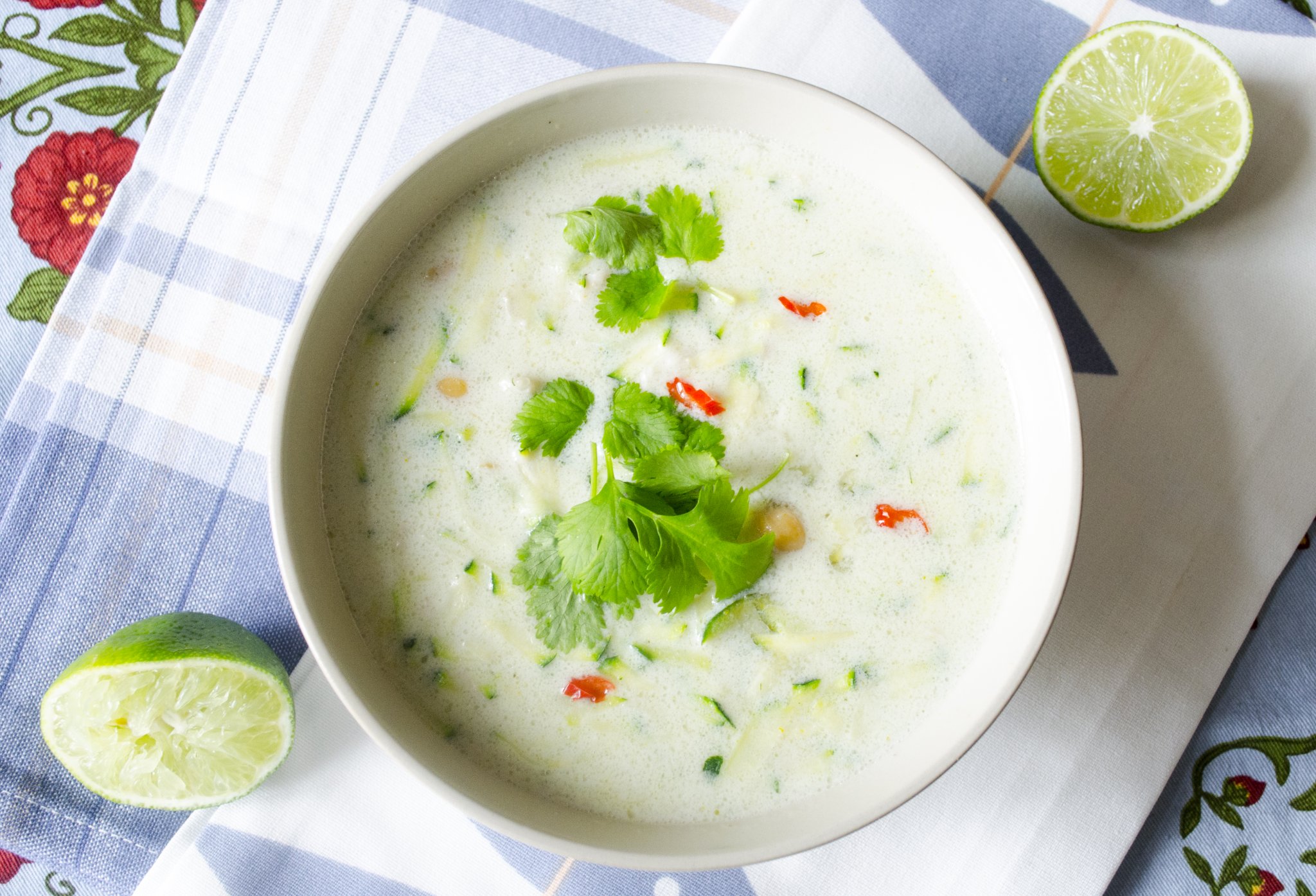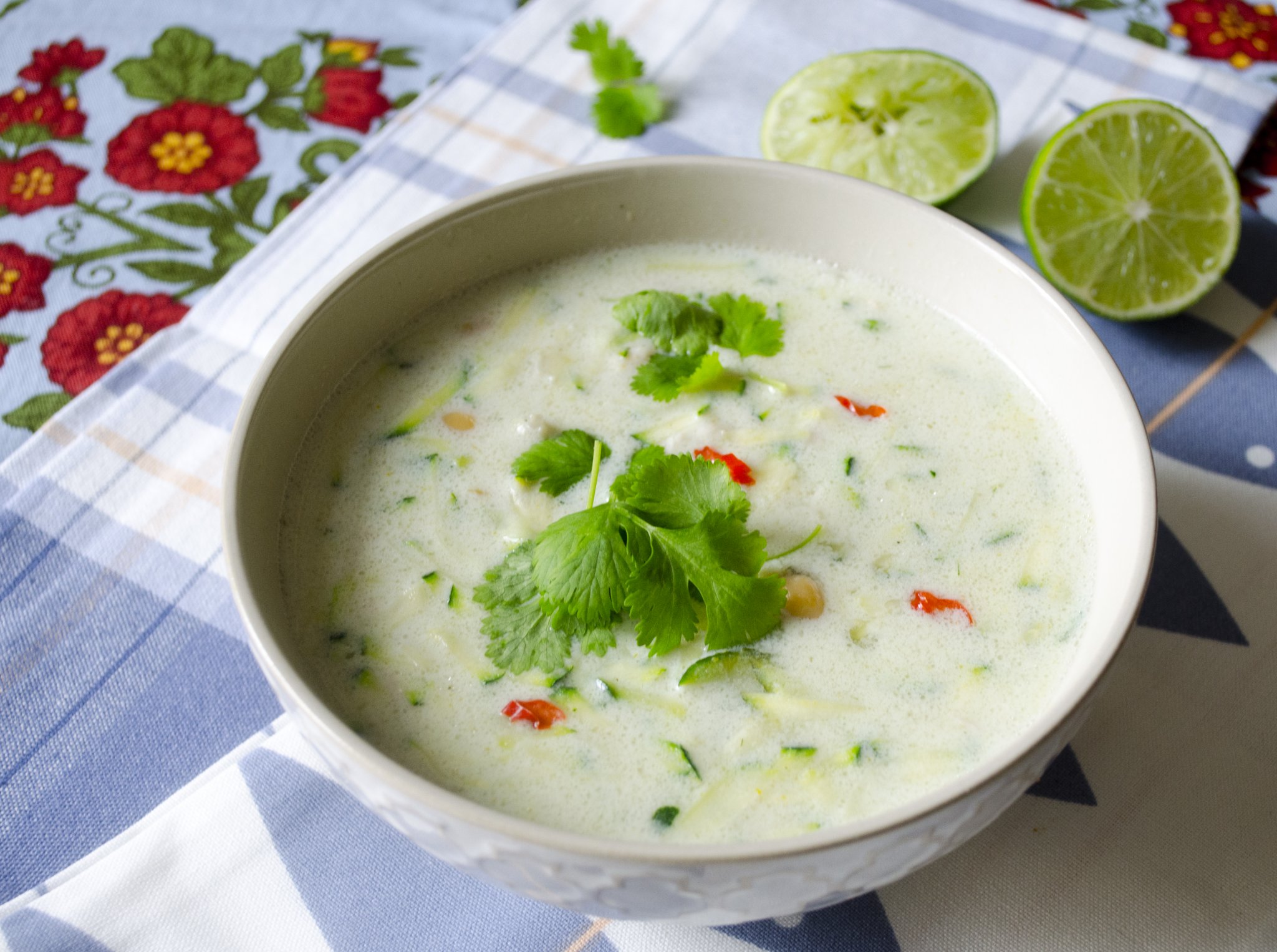 A kókusztejet ugyanannyi vízzel felforraljuk. Beledobjuk a csirkét, a nagy lyukú reszelőn lereszelt cukkinit, a csicseriborsót, a felkarikázott újhagymát, a halszószt, a curry pasztát, a cukrot, a zöldcitrom levét, a koriandert, az apróra vágott chilit és a sót.